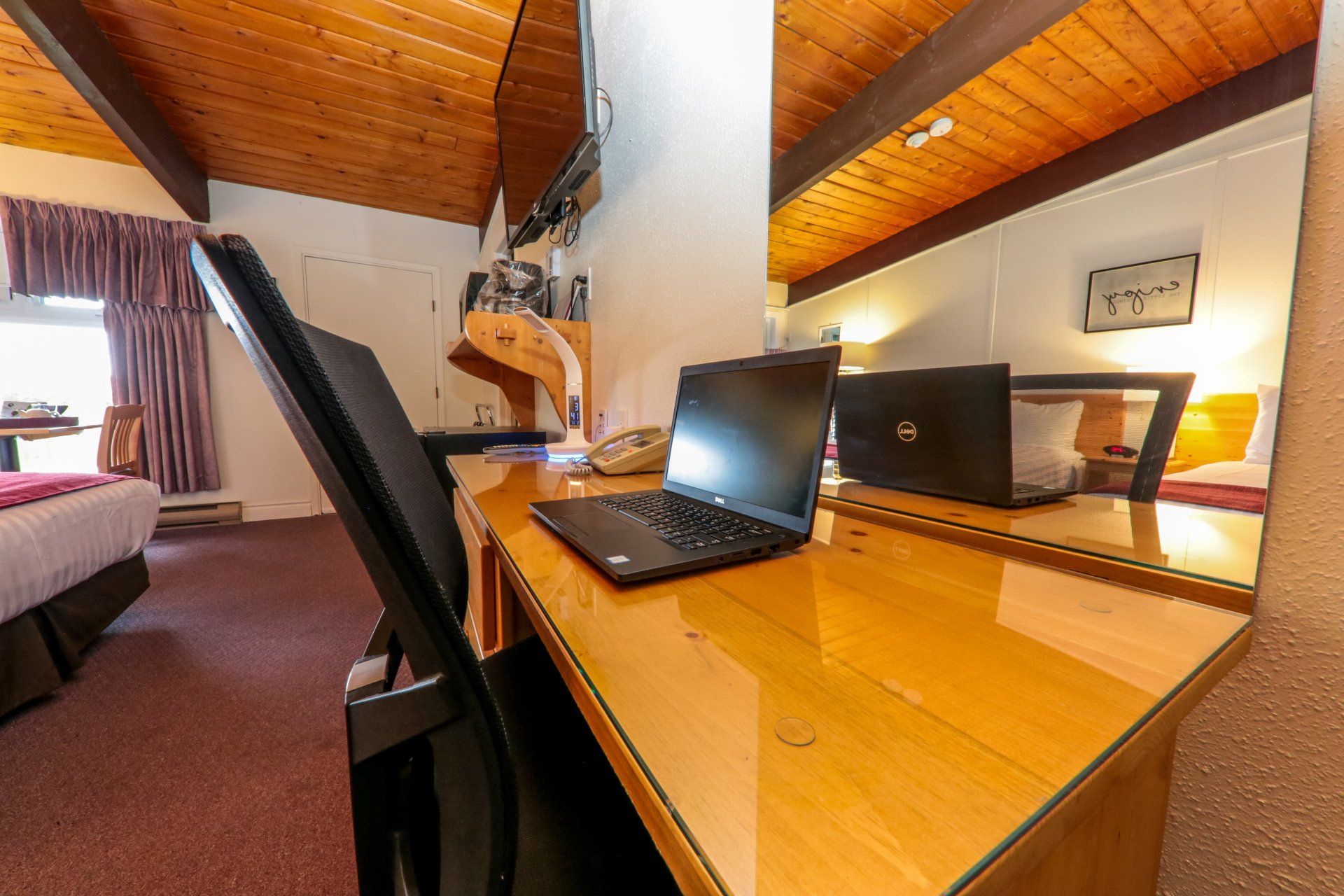 2 queen beds, parking outside room. Upper level rooms have parking at the back and a balcony at the front, overlooking the lake.